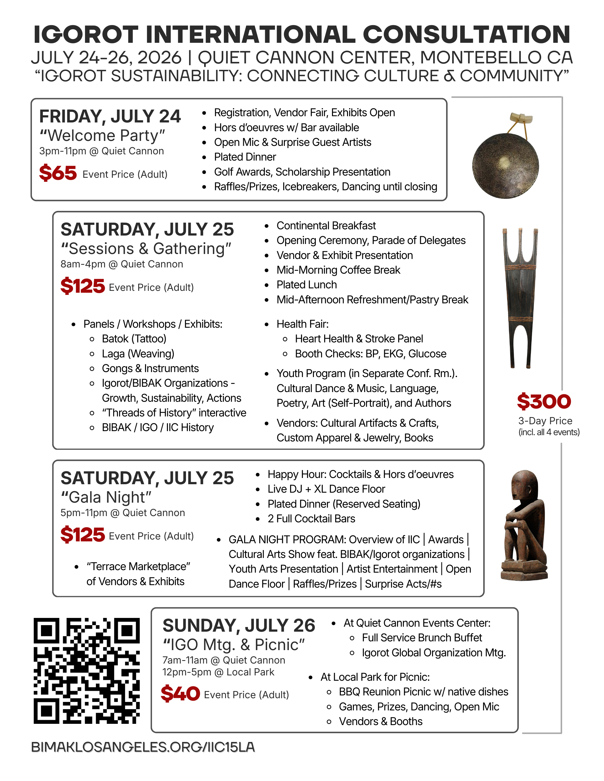 Calling all potential vendors, exhibitors, and small business owners >> The IIC is a great opportunity to network and promote your art/business/talents. Click on the orange “vendor form” button, download and fill out the form, and return via email to: bimaklosangeles@gmail.com. We look forward to showcasing our Igorot go-getters!
